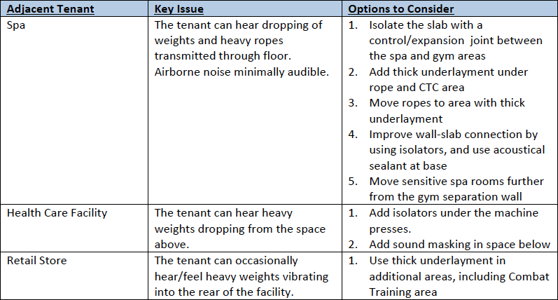 Since there are no applicable building codes for a gymnasium-to-tenant wall or floor-ceiling system, and since numerous noise mitigation efforts have already been undertaken, it is our assessment that the gym has made reasonable efforts to reduce the noise in this space to an acceptable level.