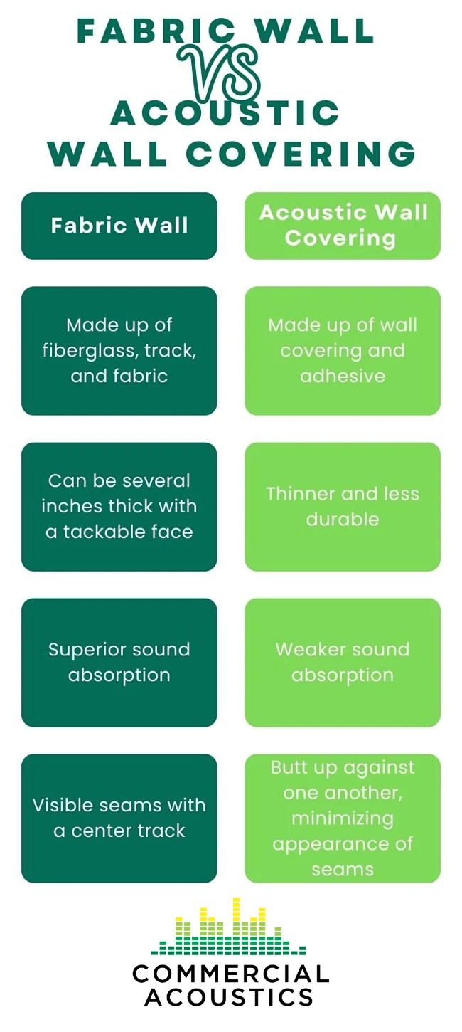 Fabric walls use a track, fiberglass core, and fabric facing for higher absorption. Wall coverings are thin polyester sheets that provide minor acoustic benefits but focus on aesthetics.